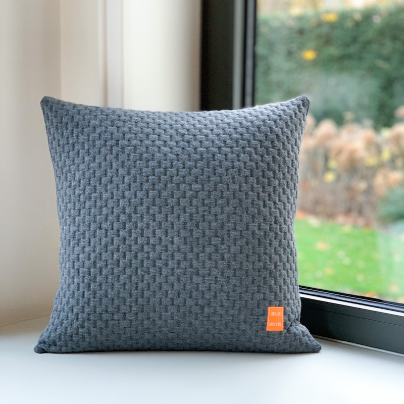 Dark grey square cushion with lines in ‘wall’ pattern. The knitted jacquard fabric is a polyester viscose mix.